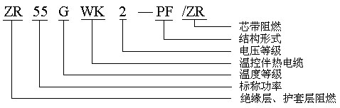 ZR65GWK3-PF 即:阻燃高温屏蔽防护型,10℃时每米输出功率65W,工作电压380V,具有阻燃、防爆、防护性能。